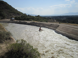 We did it on a section of the canal that drops down a few feet abruptly causing the water there to flow about 15 miles an hour. This is just fast enough to keep you afloat on a board, in our case a wakeskate. Getting on the board was the most difficult part and was done more easily with someone in the water with you helping hold the board until you could get both feet on it. Above the drop the water is about two feet deep and below, it is probably closer to three or four. There are no turbines in the churning water below so you can safely fall and shoot out to the other side. There is a chance of getting caught in a whirlpool, but the water is not very deep and as long as you're still conscious you should be able to get out. Do it at your own risk of getting caught or killed.